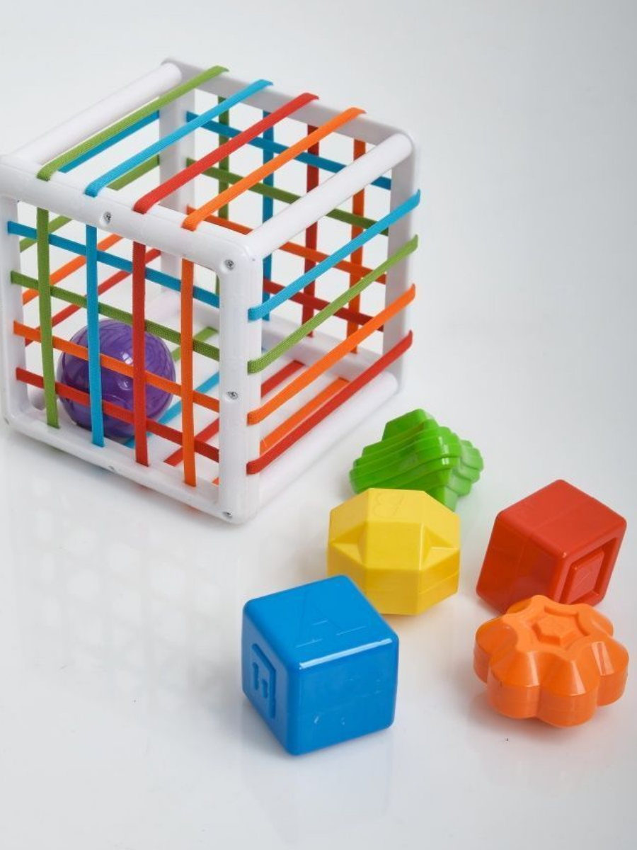 Игра по системе Монтессори «Тактильный куб «Фигуры»• Размеры сортера: 12х12х12 см. • В комплекте 6 кубиков разной геометрической формы (6х6х4 см.) • По сторонам сортера натянуты резинки через которые нужно просунуть внутрь кубики. • Материалы: пластик, текстиль. • Соответствует требованиям безопасности продукции.