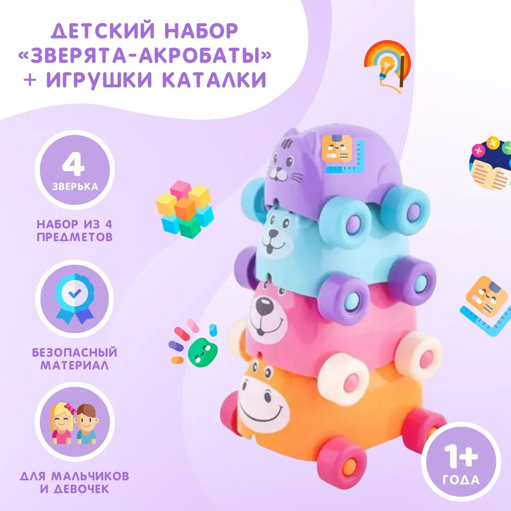 Пирамидка каталка «Зверята-акробаты»Пирамидка «Зверята-акробаты» — многофункциональная игрушка, которая может быть пирамидкой, паровозиком и отдельными фигурками. Она познакомит малыша с цветами, размерами и формами. Особенности Фрагменты сцепляются между собой в паровозик с помощью креплений на них. Элементы пирамидки — это четыре фигурки c колёсиками в виде кошки, собаки, коровы и мишки. Фигурки отличаются по размеру. Их можно ставить […]
