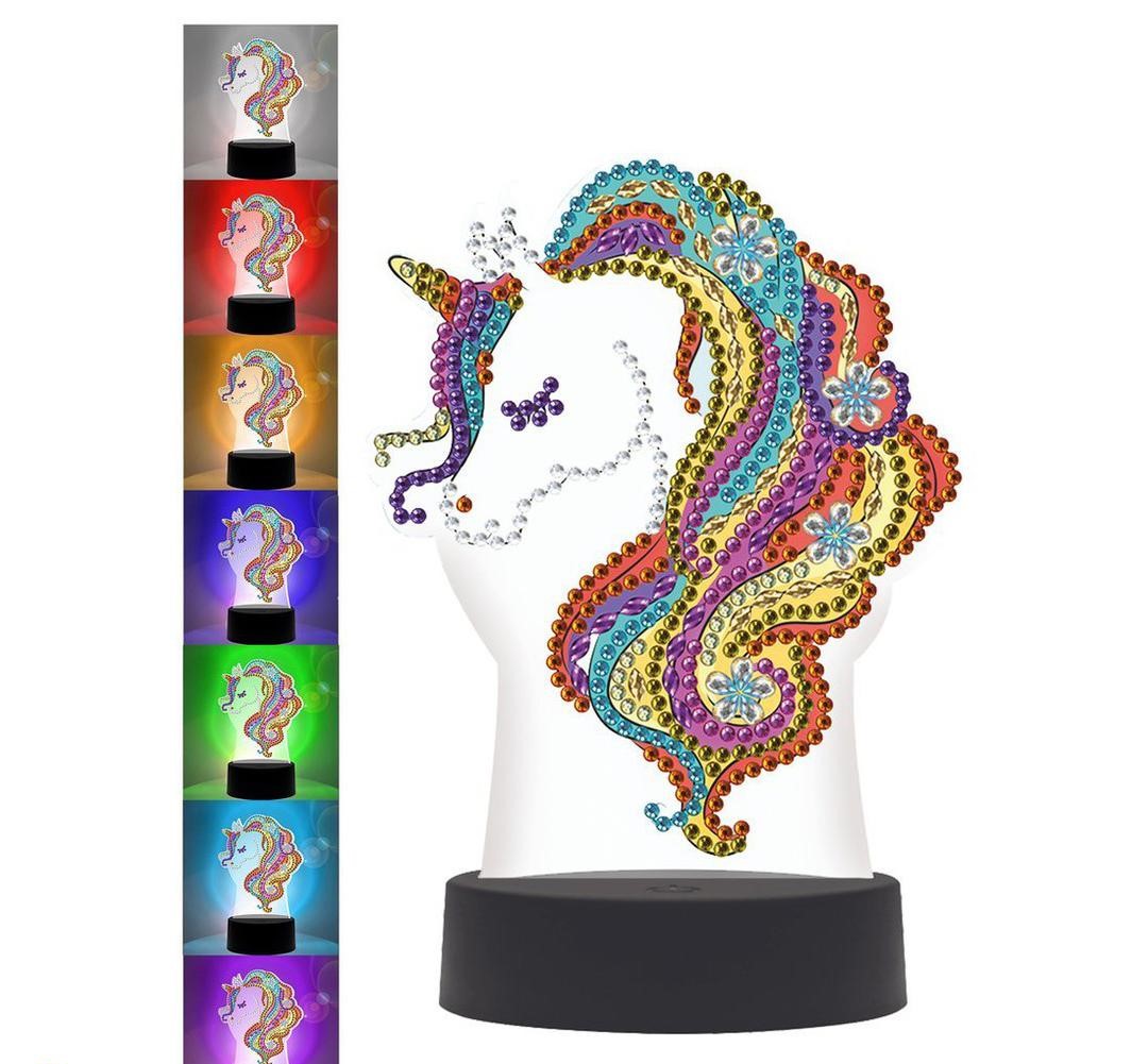 Набор с алмазной мозаикой «Единорог» от ТМ Color Puppy предназначен для декорирования уникального светильника. В нём предусмотрено целых 7 цветовых режимов свечения, эффектность которого будут подчёркивать роскошные сверкающие стразы! В комплект входят: алмазная мозаика-светильник, инструмент для наклеивания страз, ёмкость для страз, стразы. Как декорировать светильник: 1. Прозрачное защитное покрытие нужно снимать постепенно, выкладывая стразы только на определённые участки основы. Это предотвратит попадание пыли. 2. Инструмент для выкладывания страз следует аккуратно воткнуть в розовый квадрат. Далее с помощью этого инструмента можно извлекать стразы из ёмкости. 3. Стразы необходимо выкладывать на основу в соответствии со схемой. 4. По окончании работы со стразами нужно убедиться, что они надёжно закреплены, нажав на поверхность ладонью. 5. Готовую мозаику можно вставлять в круглую основу! Светильник включается нажатием кнопки на его основании. Повторное нажатие кнопки меняет цвет свечения. Светильник работает от 3-х батареек типа АА на 1,5 V (не входят в комплект). Изготовлено из полимерных материалов.
