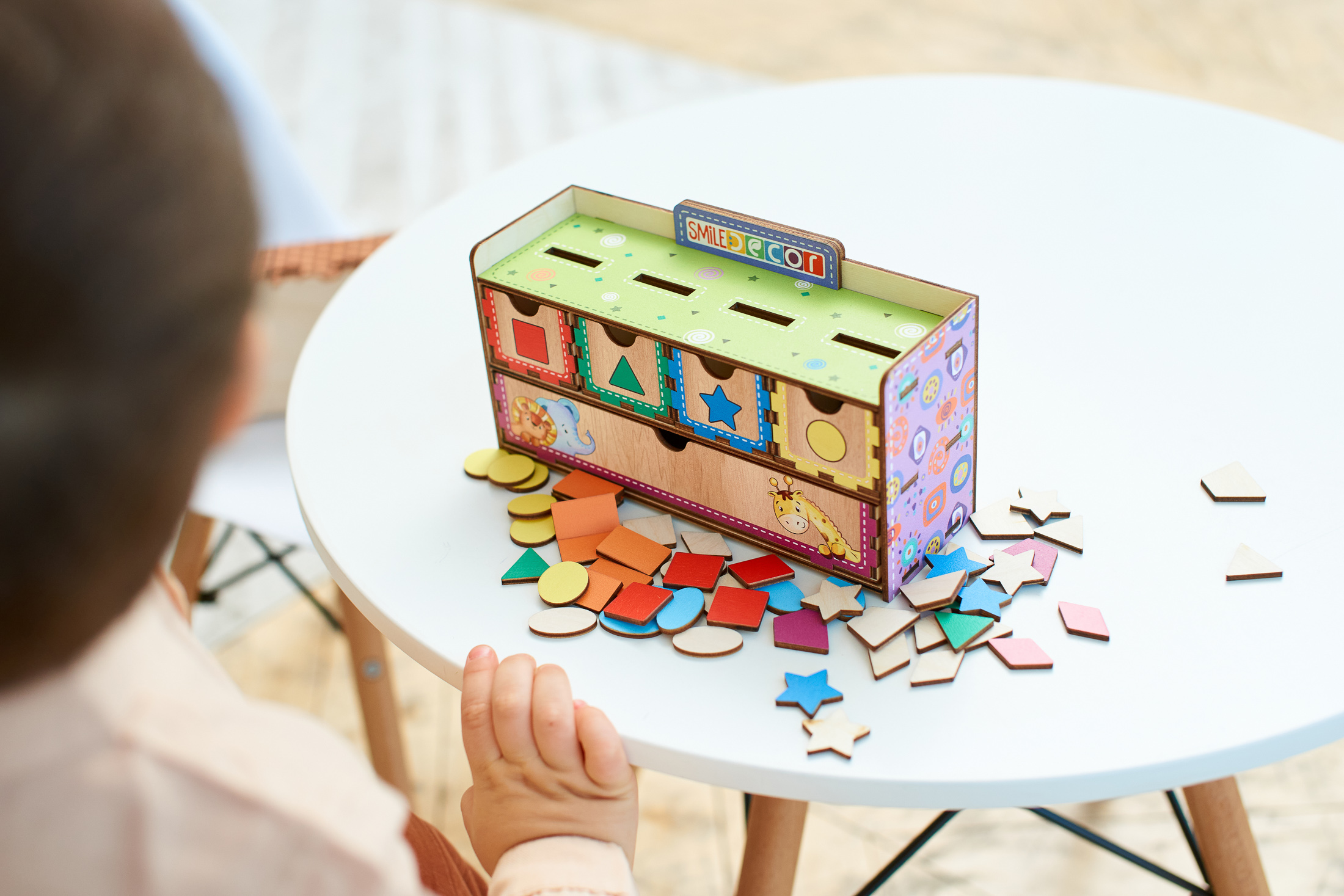 1. Игра «Цветные сортировки». Перед началом игры вставьте выдвижные ящички в комодик. Затем предложите ребенку самостоятельно разложить фигуры в соответствующие ящички, вставляя их в специальные прорези на крыше комодика. Переверните выдвижные ящички другой стороной и попросите ребенка разложить все оставшиеся фигуры. Попросите ребенка каждый раз называть, какую фигуру и какого цвета он кладет в ящичек, например: красный квадрат, зеленый треугольник, голубой овал, оранжевый прямоугольник и т.д.