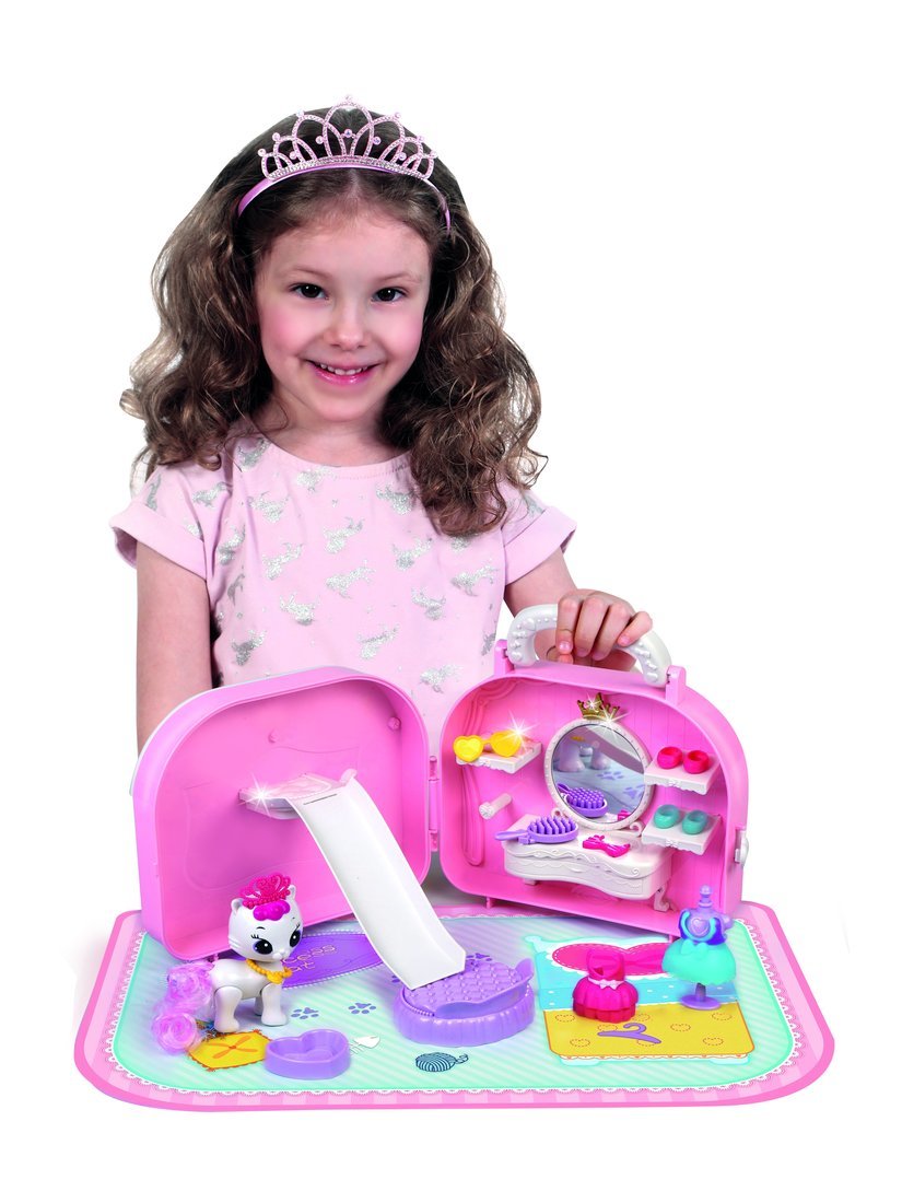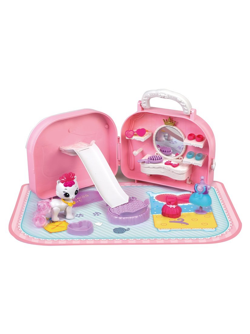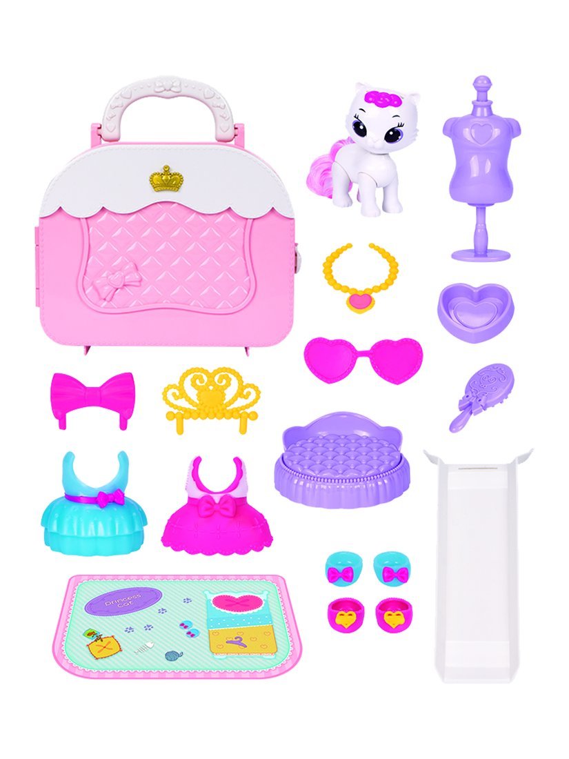 В наборе: сумка-домик, игрушка-питомец с подвижными частями тела, горка, коврик, одежда и аксессуары для питомца (кровать, миска, расческа, манекен, 2 пары ботиночек, очки, бантик, украшение на шею, 2 платья, корона).