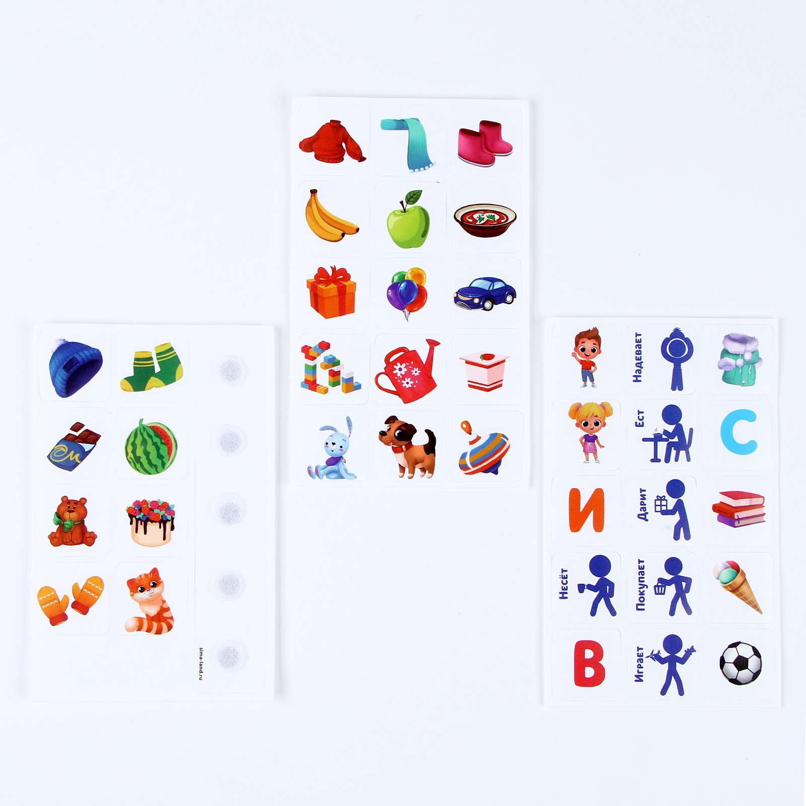 Разложите перед ребёнком все карточки, определите, что изображено на каждой, проговорите это вместе. Теперь покажите малышу пример построения предложения с помощью карточек. Затем попросите его сделать то же самое.