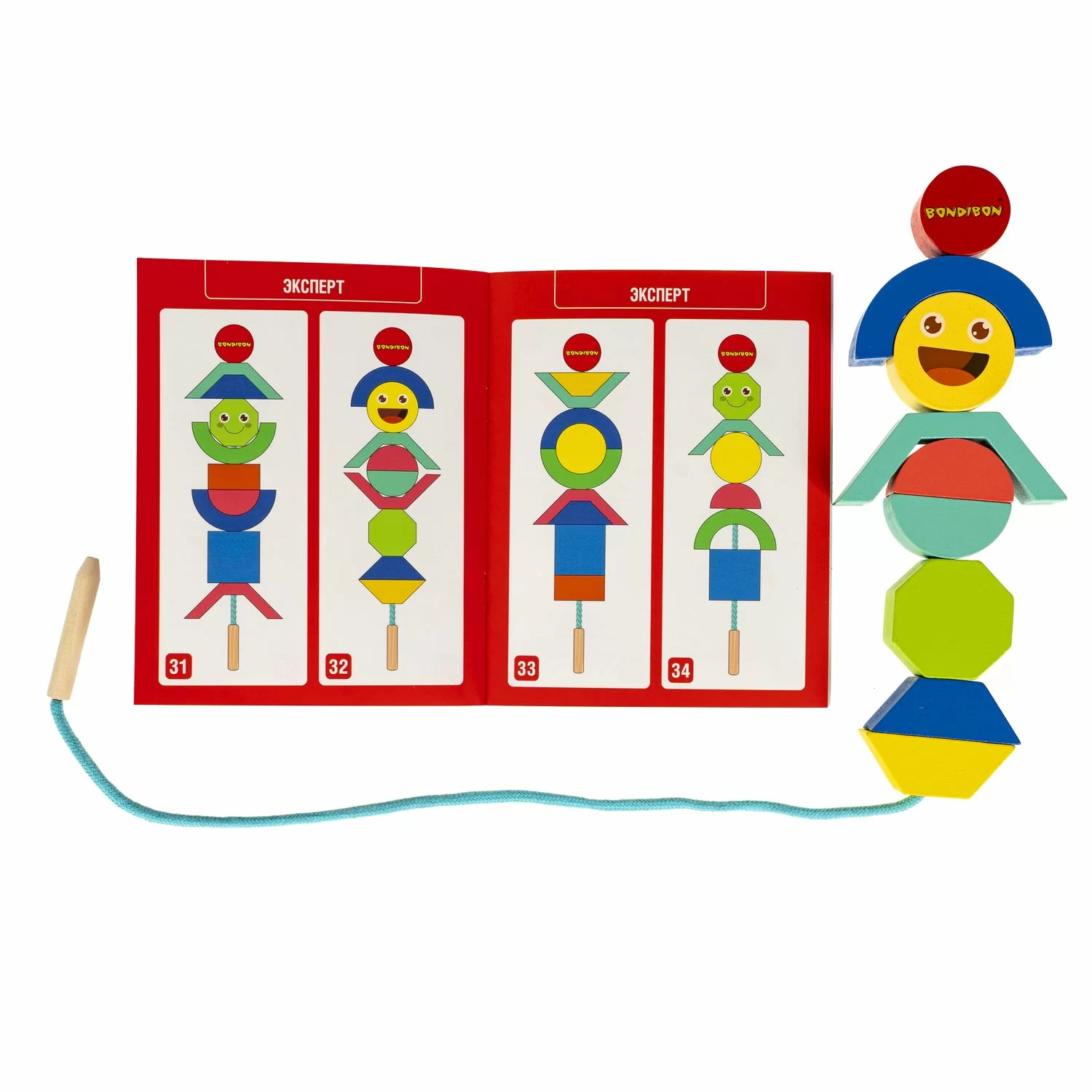 В набор входят: деревянные детали, подставка, шнурок, книжка с заданиями.