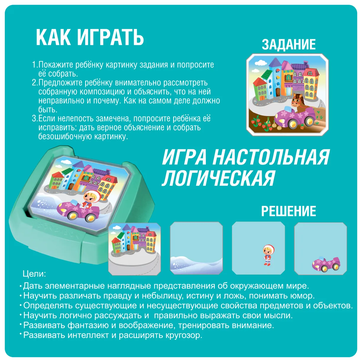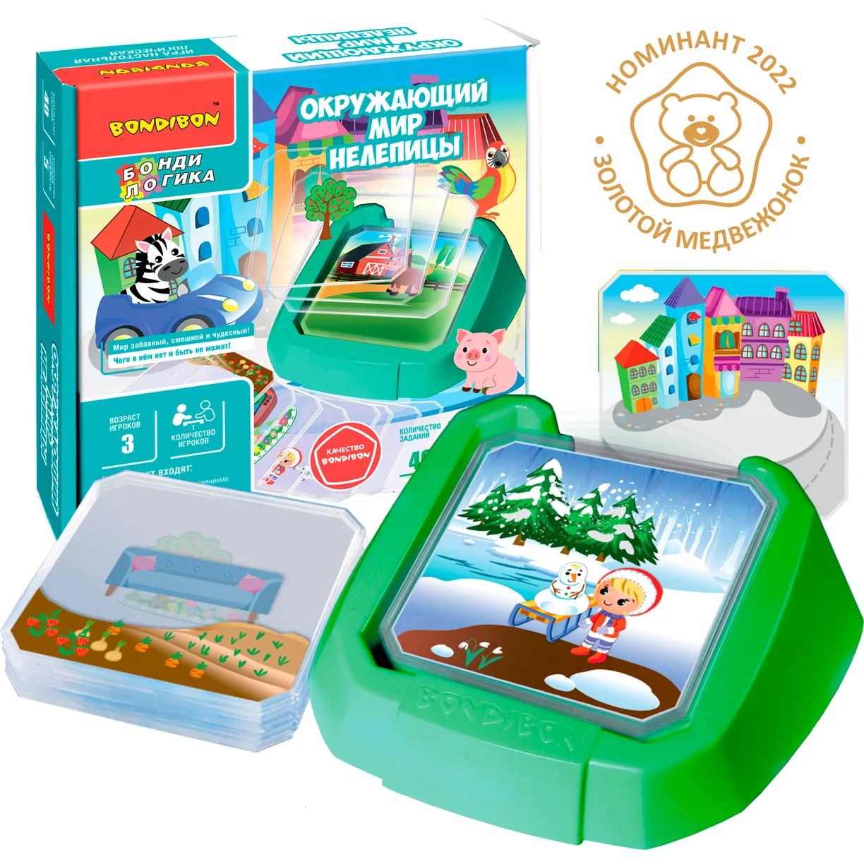 Настольная логическая игра ОКРУЖАЮЩИЙ МИР. НЕЛЕПИЦЫ БондиЛогика Bondibon. Головоломка ОКРУЖАЮЩИЙ МИР. НЕЛЕПИЦЫ от Bondibon вызовет огромный интерес у ребенка. Она совмещает в себе правила двух очень популярных настольных игр – «Цветовой код» и «Что перепутал художник». С помощью сюжетных картинок-путаниц малыши научатся различать правду и небылицу, потренируют внимание и память. Покажите ребенку картинку задания, затем попросите собрать ее на подставке с помощью карточки и прозрачных плиток. Найдите, что на собранной композиции неправильно и почему. Прекрасный подарок серии БондиЛогика для дошкольников и первоклассников! Оригинальные настольные игры, логические задачки, развивающие игрушки пользуются заслуженной популярностью у малышей. Цветные сюжетные карточки с заданиями – настоящий подарок для детей, заскучавших в дороге. Интеллектуальные развлечения обеспечивают ребенку приятные впечатления, спасают от скуки и помогают осваивать полезные навыки. Развивающие игры покупают и в качестве игрушки для мальчиков, и как игрушки для девочек. Прикольные настольные игры можно использовать не только на столе, они пригодятся и во время отдыха на природе или в поездке. Такие развлечения, как настольная игра – великолепная тренировка iq, логику, память и мелкую моторику. Учимся, играя – самая надежная стратегия развития Вашего малыша. Веселая головоломка поможет заучить новые слова и расширить кругозор! Крутая интересная мини игра – отличный напарник для посещения детского сада. Продуманная упаковка настолки развивашки делает игру удобной для улицы. Проведите интеллектуальные уличные соревнования с друзьями! Ведь некоторые задания способны обеспечить настоящий взрыв мозга даже взрослым и подойдут для всей семьи и большой компании! Яркая коробка с игрой от Бондибон – самостоятельный презент для ребенка от трех лет, великолепное дополнение в подарочный набор на день рождения для друга, оригинальный сюрприз на любой праздник и прекрасный подарок без повода. Такие детские игрушки – популярные товары интернет магазинов круглый год!