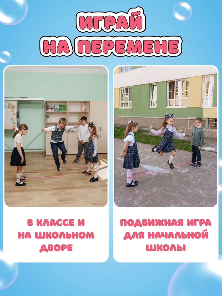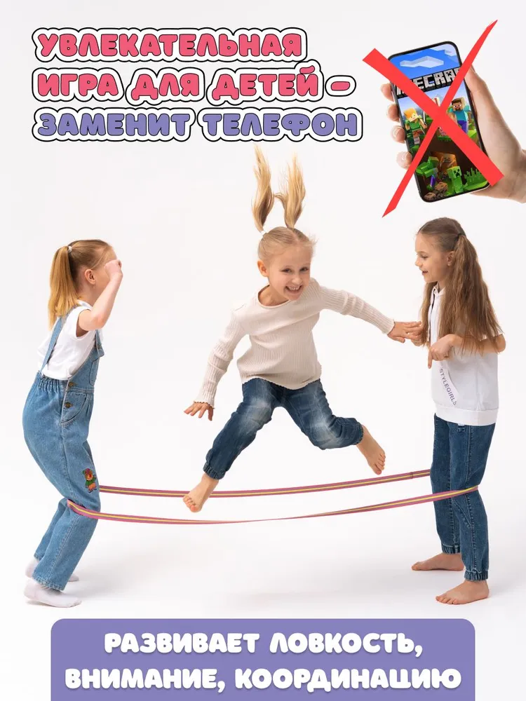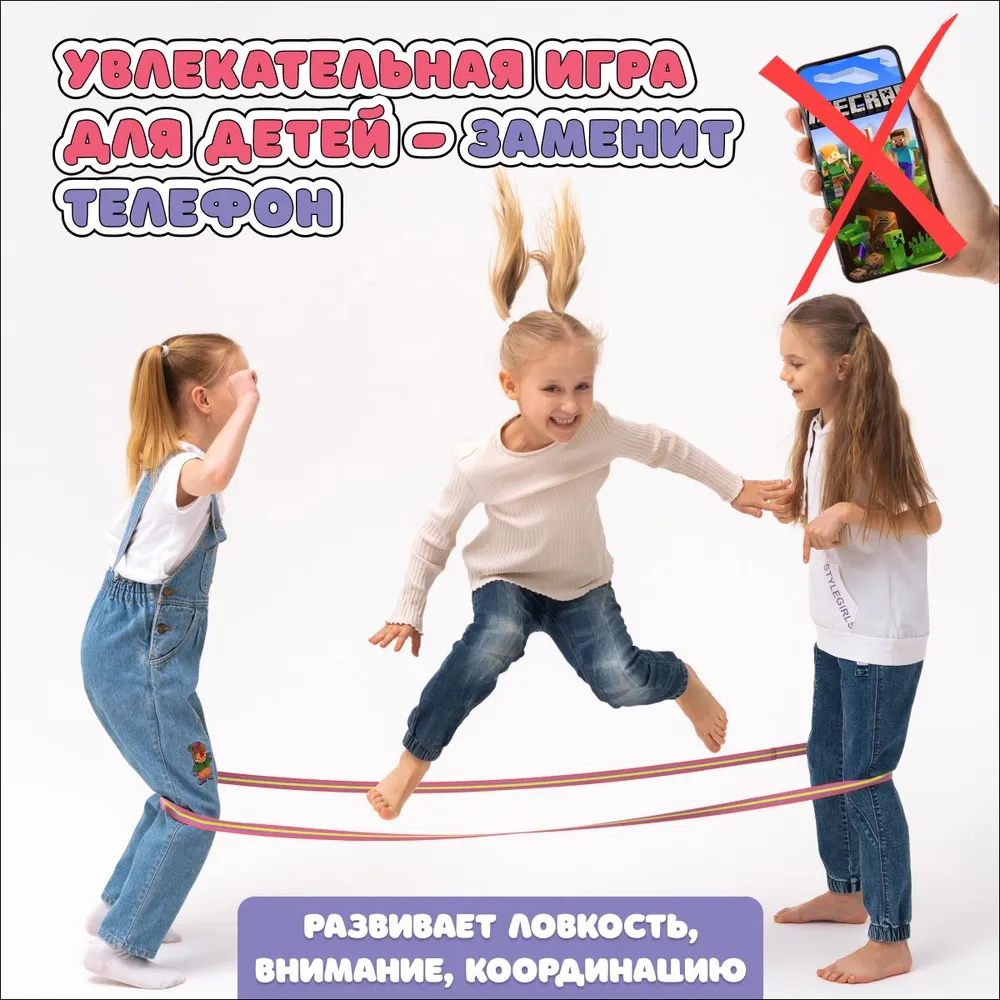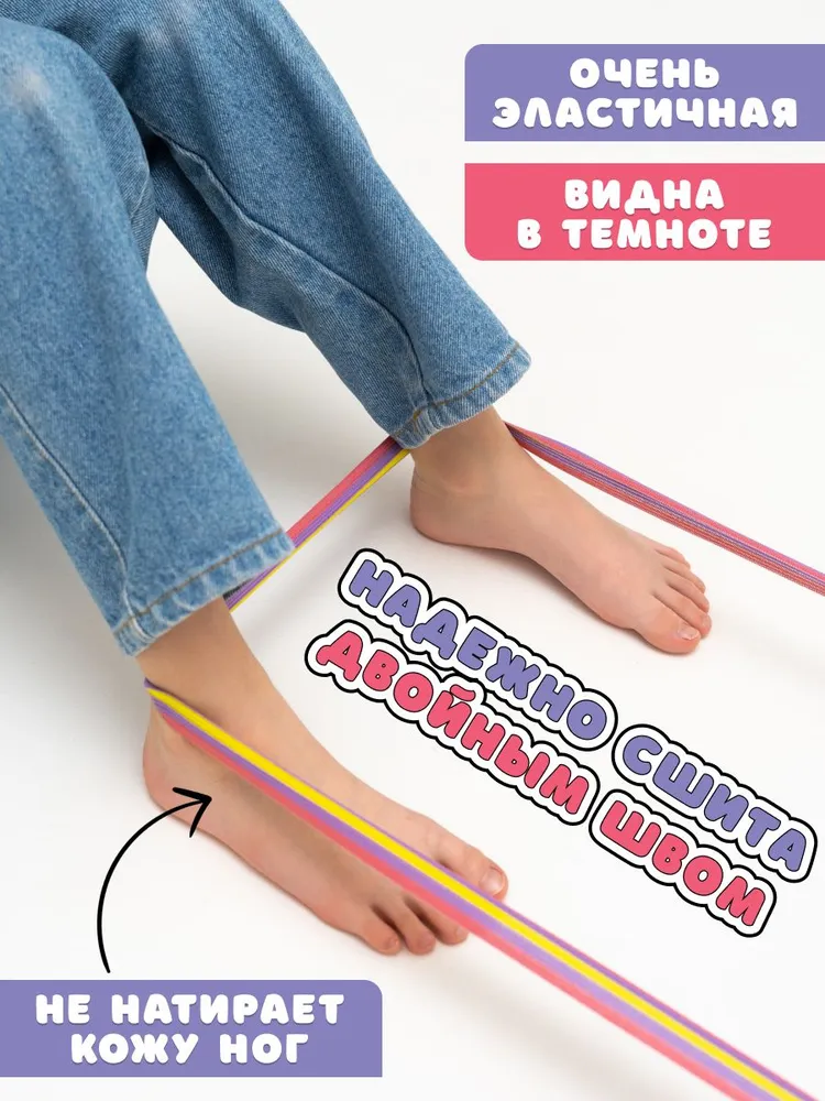 Легендарная резиночка для прыжков на улице – любимая игра детей, которые уже взрослые! Популярное развлечение во дворе теперь в новом современном исполнении. Это игровой набор с красочной эластичной резинкой, подарочным мешочком, правилами игры в удобном формате книжки-гармошки. Спортивная игрушка упакована в яркую коробку, и будет хорошим подарком племяннице, внучке, дочке . Подвижные игры на улице летом снова будут интересными и развивающими. Если есть компания из трех друзей, то будет еще веселее прыгать. Девочки или мальчики, большая компания — зовите всех для активного отдыха на свежем воздухе. Резинку удобно ребенку брать с собой в дорогу, в школу, в поездку, в лагерь, во двор, на природу, на дачу, в парк, на море, на пляж. Самое лучшее развлечение для детского сада, для школы на перемене. Давайте прыгать вместе!