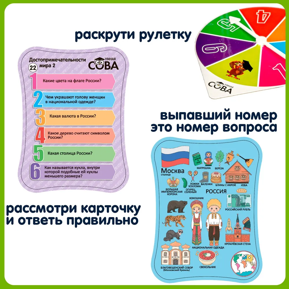 Путешествуйте, не выходя из дома с викториной ДОСТОПРИМЕЧАТЕЛЬНОСТИ МИРА 2 от Bondibon. Настольная игра серии Умная Сова, разработанная на базе авторской методики — отличный способ расширить кругозор. Выберите одну из 32 красочных карточек. Раскрутите рулетку и прочитайте тот вопрос, номер которого выпал. Переверните песочные часы и внимательно изучите изображение. По истечении времени ответьте на вопрос. Заберите карточку себе, если задание выполнено верно. Постепенно переходите к более сложному варианту игры. Побеждает участник, который первым соберет 10 карточек. В процессе игры ребенок познакомится с основными достопримечательностями, флагами, национальными костюмами, традициями разных стран, разовьет скорость мышления, зрительную память, усидчивость, внимательность и наблюдательность. В комплект входят: 32 двусторонние карточки из твердого картона, рулетка, песочные часы. 2 уровня сложности Количество игроков 1-4 Возраст 7+ Соберите всю серию викторин Умная Сова от Бондибон!