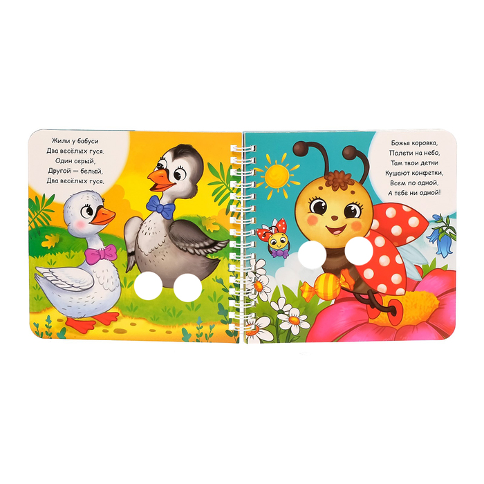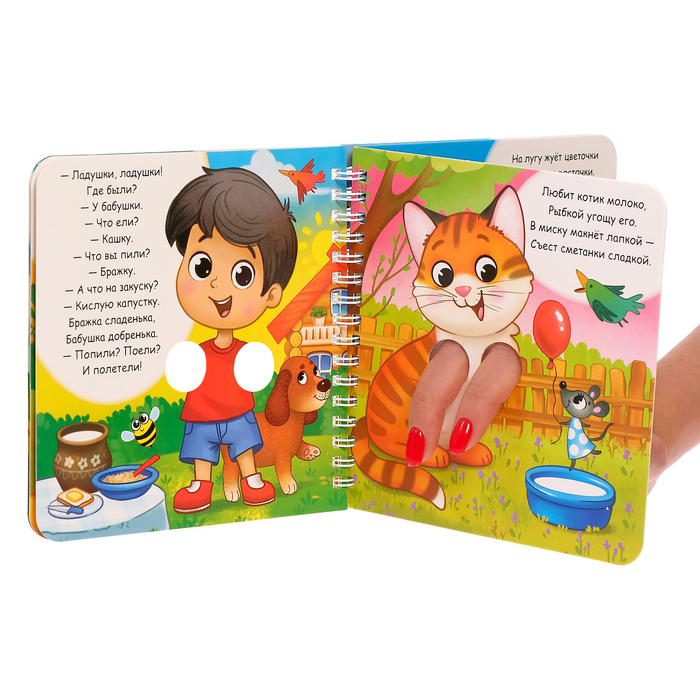Картонная книга создана для весёлого чтения и игры. В ней есть специальные прорези для пальчиков, с помощью которых малыш может оживить картинку: сделать козе рожки или ушки зайчику. Читайте и играйте вместе с крохой!