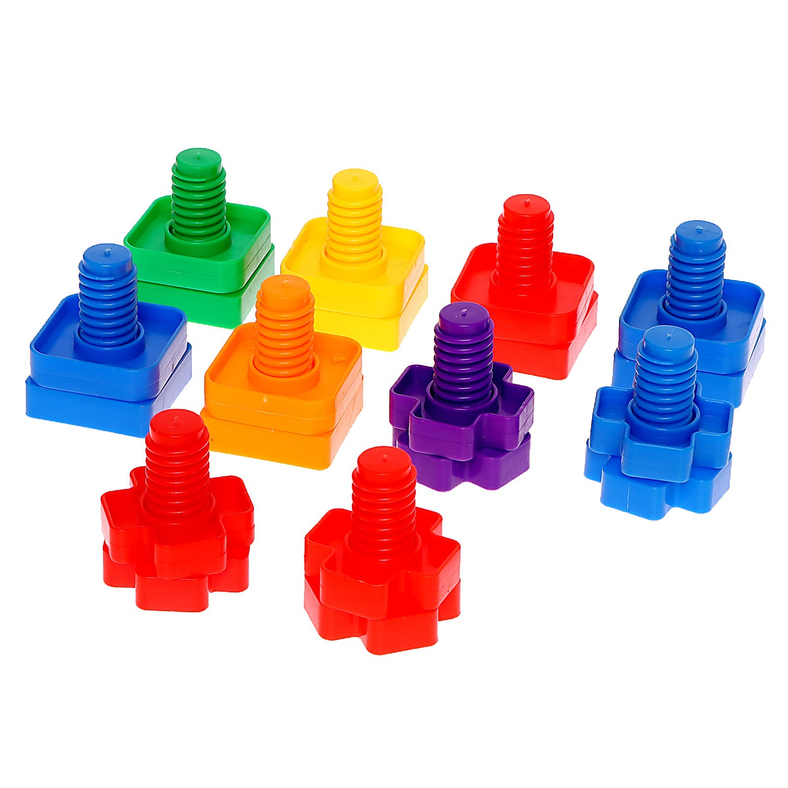 - Элементы отличаются цветом и формой: квадратные и крестовые. Задача малыша — подобрать гайки и болты по цвету и форме.