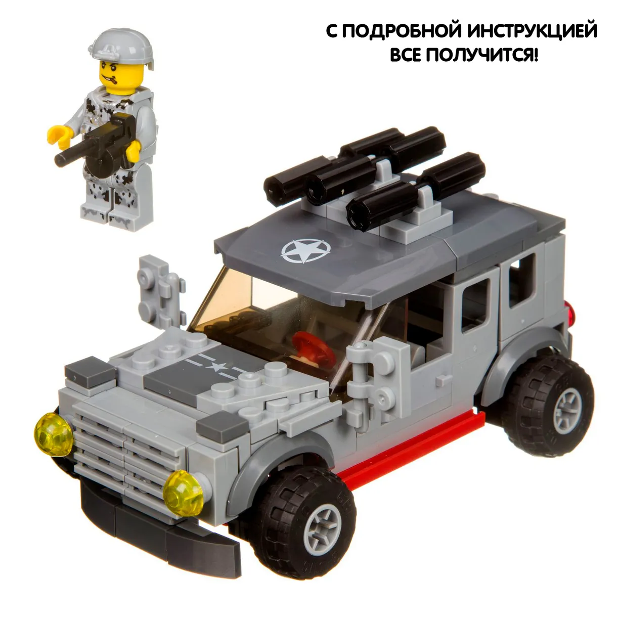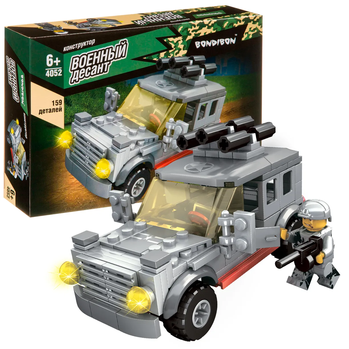 Маленькие любители военной техники по достоинству оценят этот замечательный набор! Конструктор МАШИНА из коллекции ВОЕННЫЙ ДЕСАНТ от Bondibon позволяет ребенку самостоятельно собрать джип и человечка для захватывающей игры в войнушку. Набор состоит из 159 деталей, которые легко соединяются между собой. В комплекте также содержится инструкция, следуя которой, Вы без труда соберете модель военного внедорожника и фигурку солдата с оружием. Сборка конструкторов способствует развитию моторики, воображения, логического и пространственного мышления. Конструктор МАШИНА от Бондибон станет прекрасным подарком для мальчиков на день рождения и по любому другому поводу. Все детали изготовлены из качественной безопасной пластмассы и совместимы с деталями конструкторов мировых производителей.