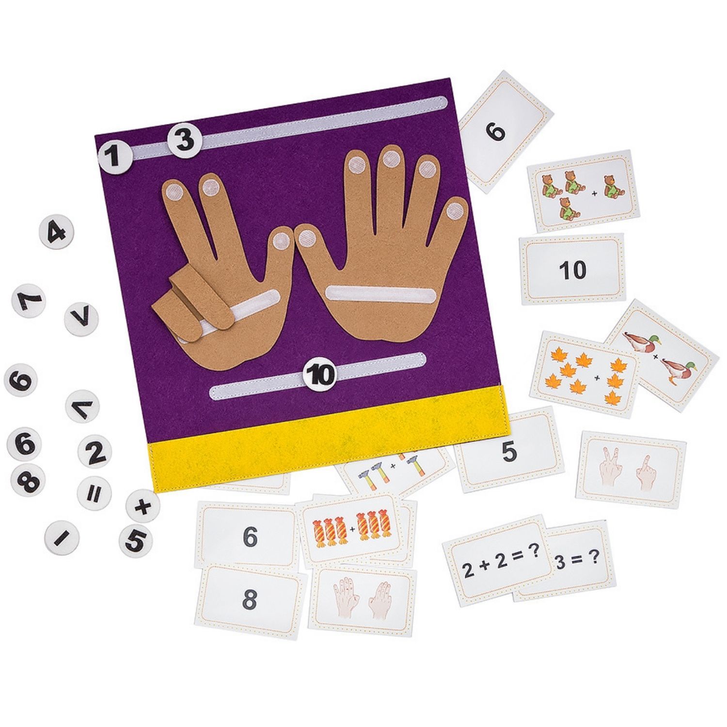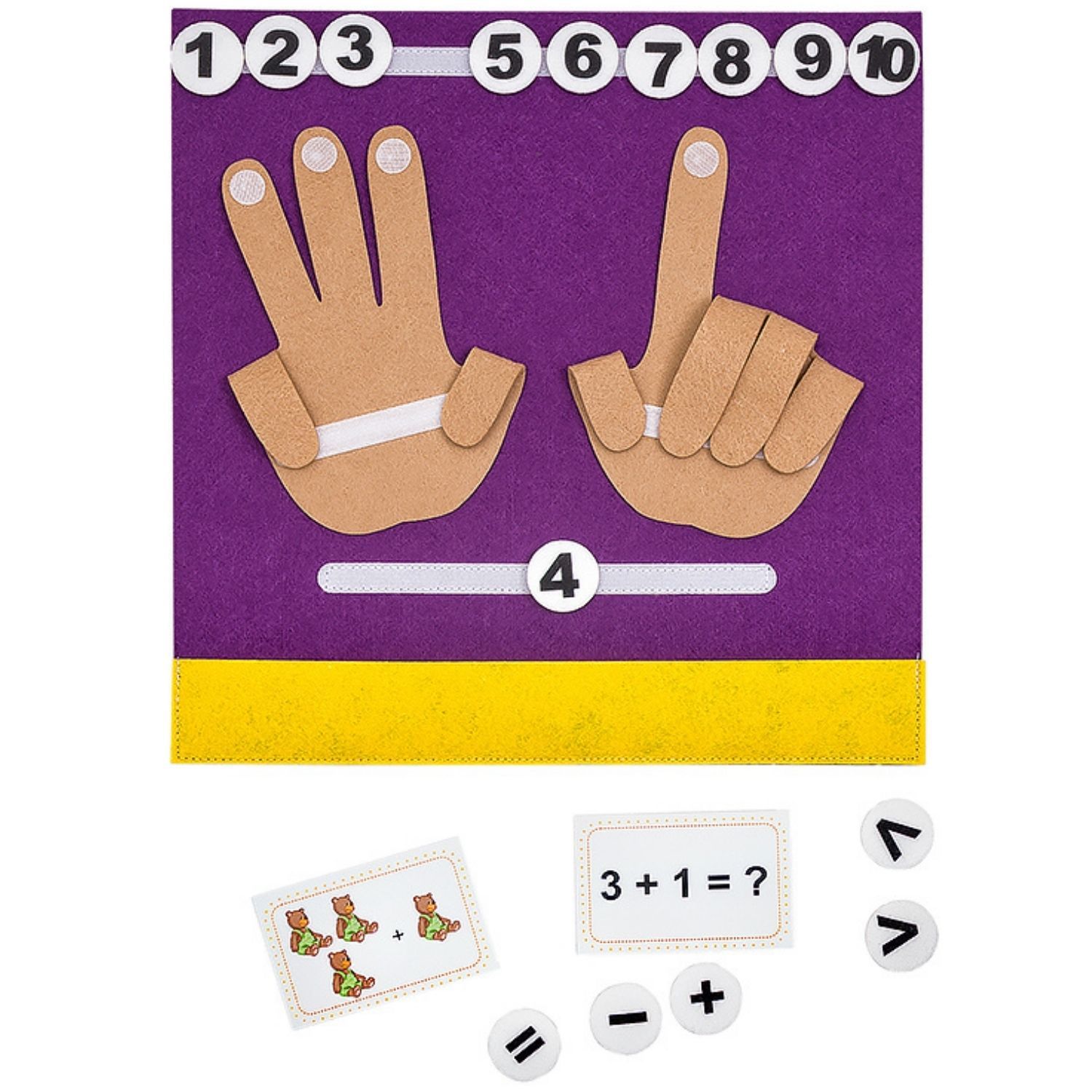 Разложите коврик на столе или полу, рассмотрите его вместе с ребёнком. Посчитайте все пальчики на ладошках. Попросите ребёнка показать правую, левую ладошку. Расскажите малышу, что у каждого пальчика есть свое имя (большой, указательный, средний, безымянный, мизинец). Обсудите с ребёнком, что означают их имена. Попросите кроху показать соответствующие пальчики на его собственных ладошках.