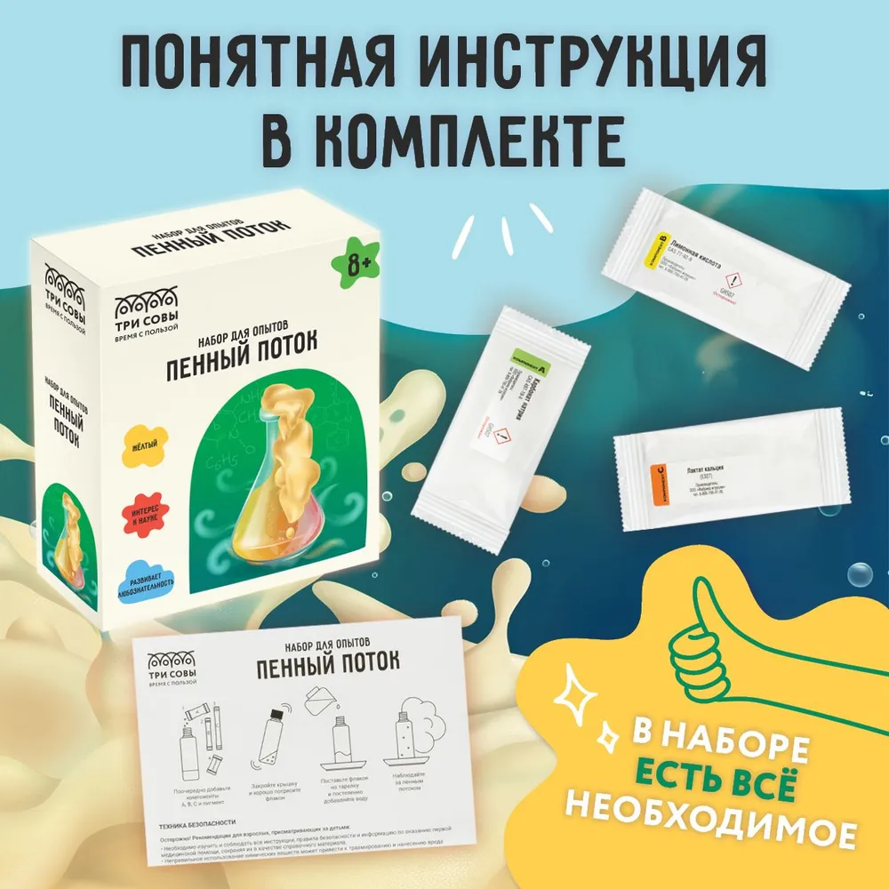Набор для опытов «Пенный поток» — Это удивительный подарок, который подходит детям от 8 до 15 лет. Идеальный выбор для вашего ребенка, дочки или сына, чтобы порадовать их на праздники или на день рождения. Этот набор поможет развить интерес ребенка к науке и играм, познакомит с химическими и физическими законами так как он содержит множество увлекательных и образовательных элементов. С помощью этого набора дети смогут проводить опыты и занимательные игры, при этом развивая свой интеллект и творческие способности.
