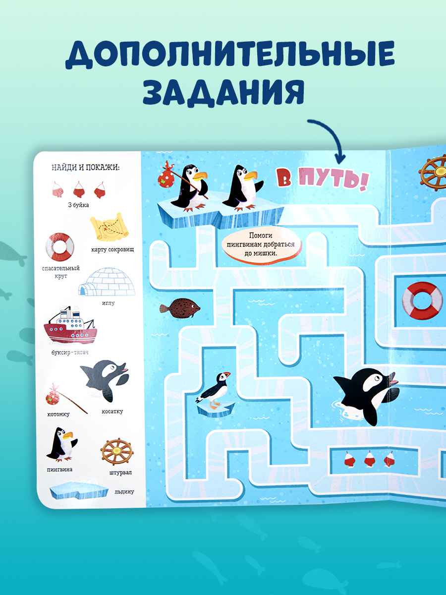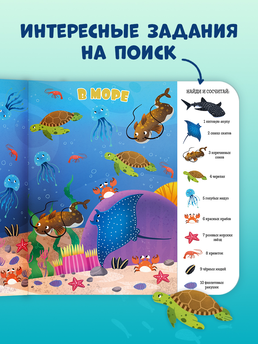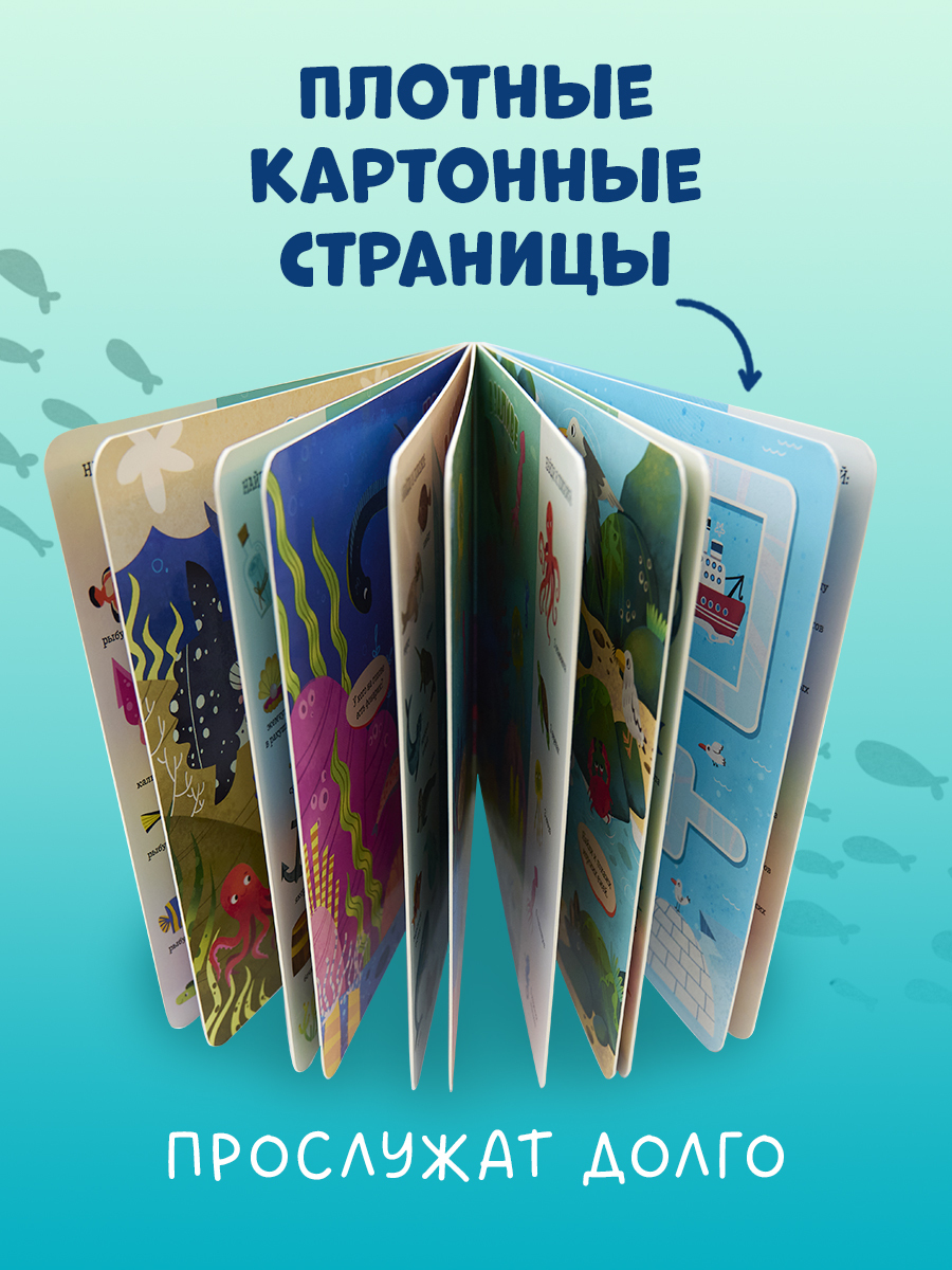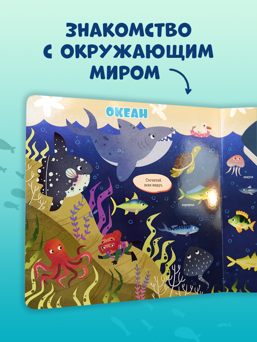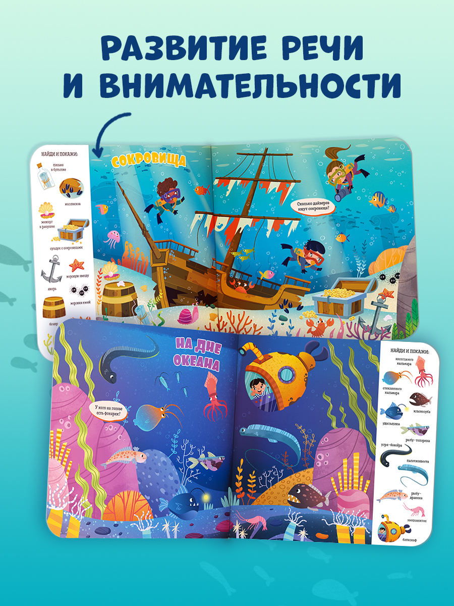 Красочные иллюстрации с крупными элементами, любимая детская игра «найди и покажи», забавные обитатели океанов и морей для поиска — идеальное сочетание для развития речи и внимательности вашего малыша. Рассматривайте вместе картинки, ищите предметы, вынесенные на край страницы, отвечайте на вопросы, а заодно ребенок будет узнавать и запоминать новые слова, тренировать навыки счета, усидчивости и развивать воображение.