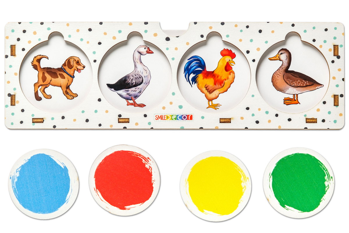2. Игра «Цветные окошки». Вставьте в игровой планшет карточку с изображением коровы, лошади, медведя и козы. Попросите ребенка закрыть, например, козу синим кружочком, медведя – красным, корову – зеленым, лошадь – желтым. Усложните игру, попросив закрыть козу, например, не синим и не желтым кружочком.
