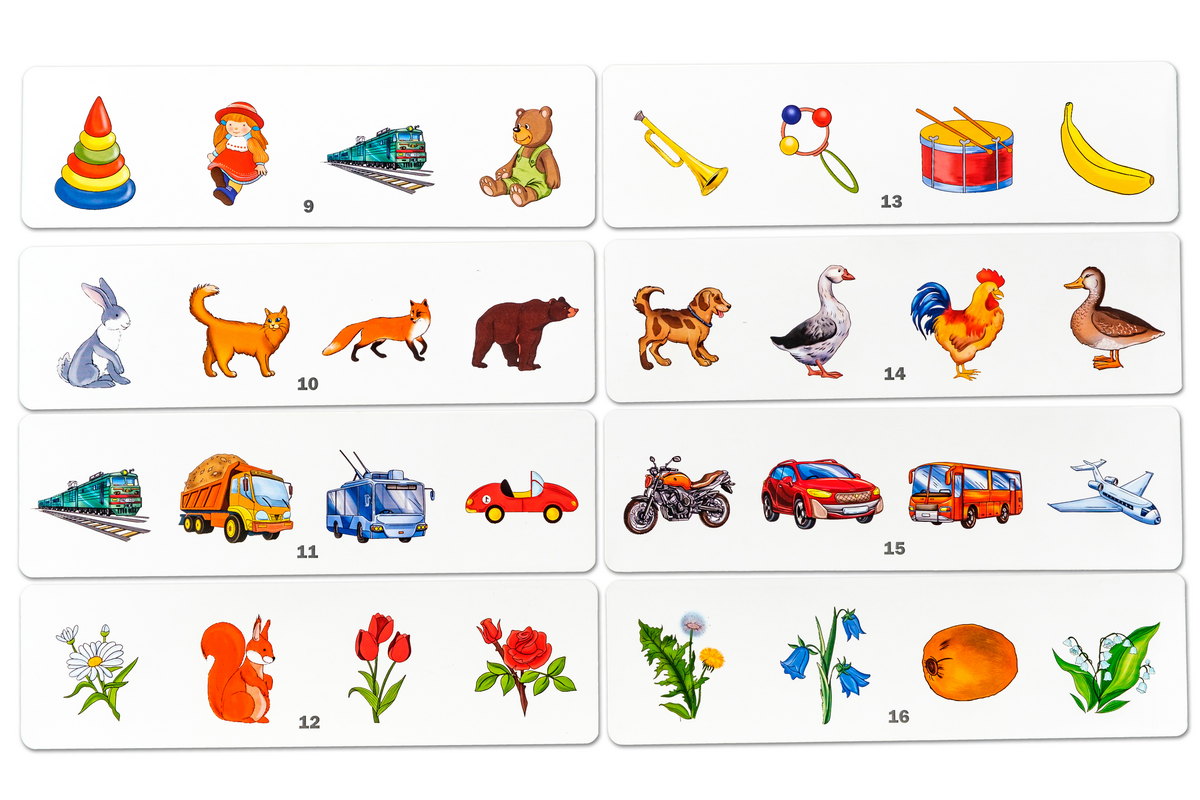 5. Игра «4-й лишний». Предложите ребенку навести порядок в окошках: определить лишний предмет на выбранной карточке, называя группу предметов одним словом или объединяя их одним признаком (чем похожи эти предметы). Попросите закрыть лишний предмет фишкой и объяснить свой выбор. Например, мишка, кукла, пирамидка – игрушки, а поезд – транспорт, поэтому – лишний.