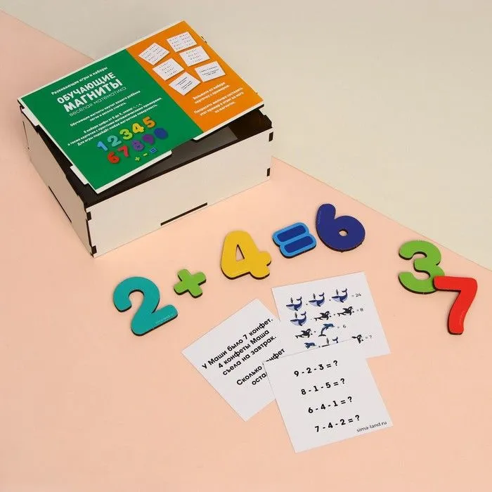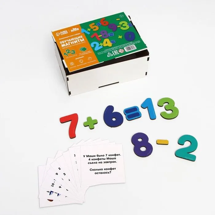 В наборе есть магниты с цифрами и карточки с заданиями. Задача малыша — решать их с помощью магнитных цифр. Например: возьмите карточку с задачей, проиллюстрируйте её с помощью магнитов. Решите пример.