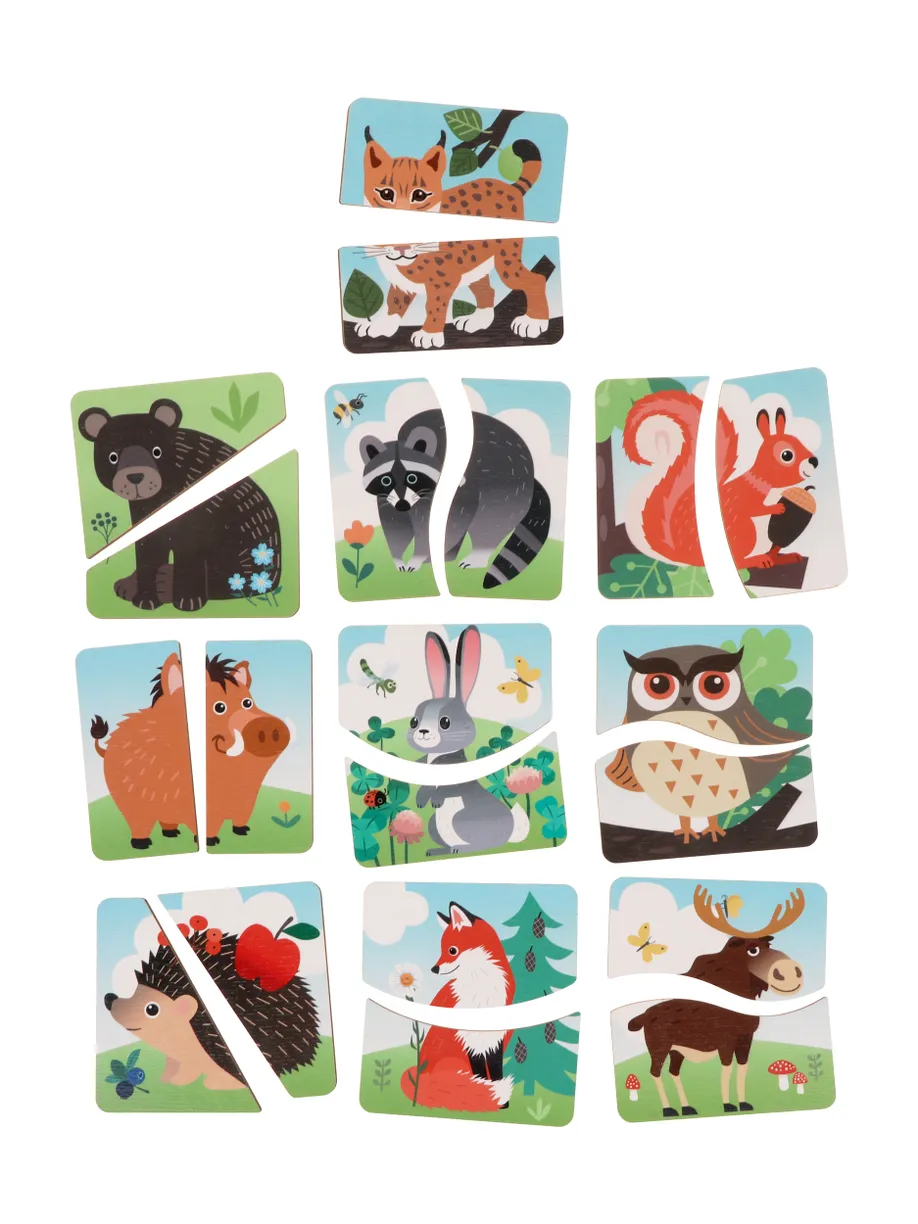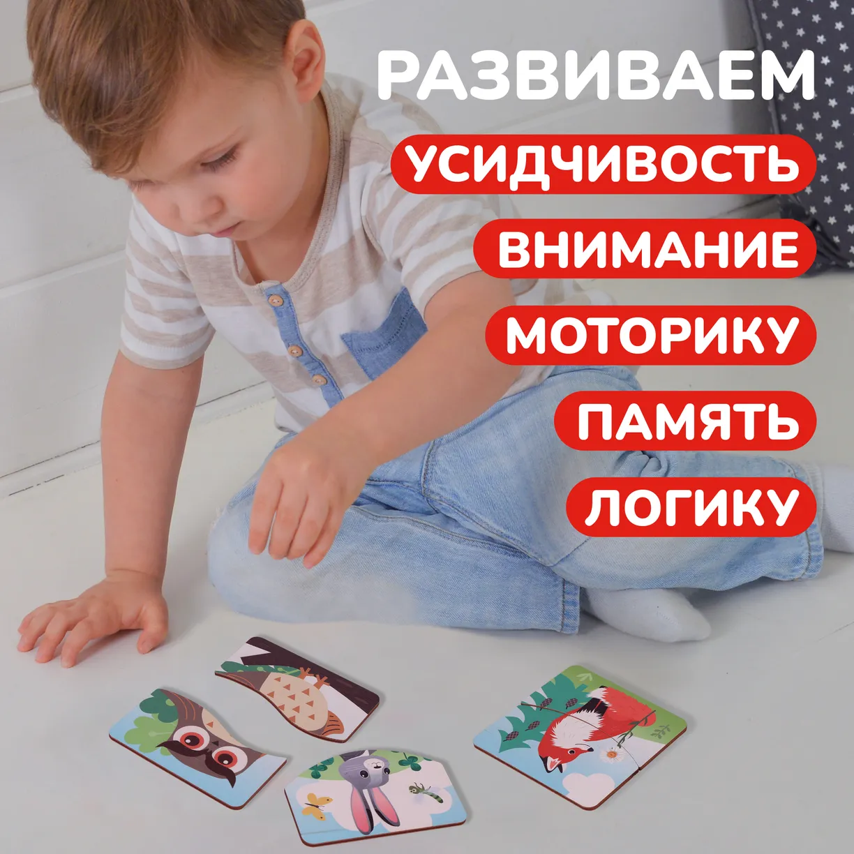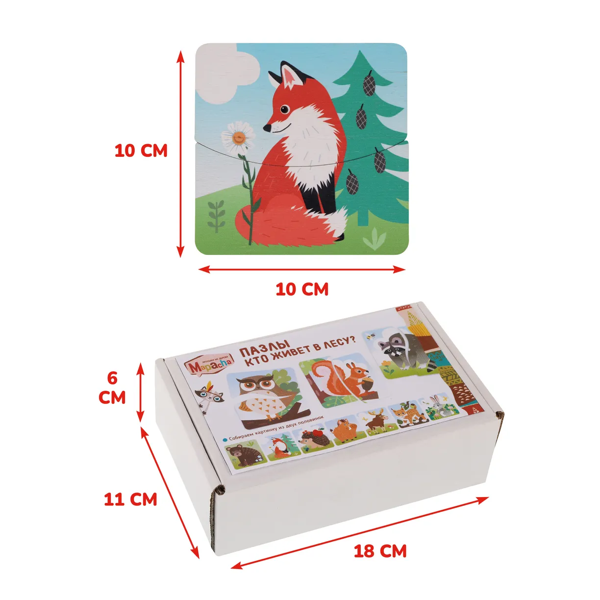 Набор пазлов «Кто живет в лесу» способствует развитию мелкой моторики, памяти, логики и наглядно-образного мышления малыша. Набор состоит из 10-ми пазлов – 20-ти деталей с изображением животных: совы,белочки, енота, медведя, лисички, ежика, кабанчика, оленя, рыси и зайчика. Каждый пазл состоит из двух деталей. Макси-пазлы прекрасно подойдут в качестве первых пазлов для малыша. Во время игры малыш будет учиться собирать пазлы из двух частей, запоминать названия животных и пополнять лексический запас. Крупные детали делают сборку пазлов максимально комфортной для ребенка. Детали головоломки удобно хранить – пазлы поставляются в картонной коробке. Пазлы можно использовать многократно, ведь рисунок нанесен прямо на дерево, а не на бумагу – это придает деталям дополнительную прочность. Размер собранного пазла из двух деталей (ДxШxВ): 10x10x0,3 см .Размер коробки (ДxШxВ): 18,5x11x6 см. Изделие изготовлено из древесных материалов. Все детали тщательно отшлифованы и безопасны для детских пальчиков. Рекомендованный возраст: 1 год +