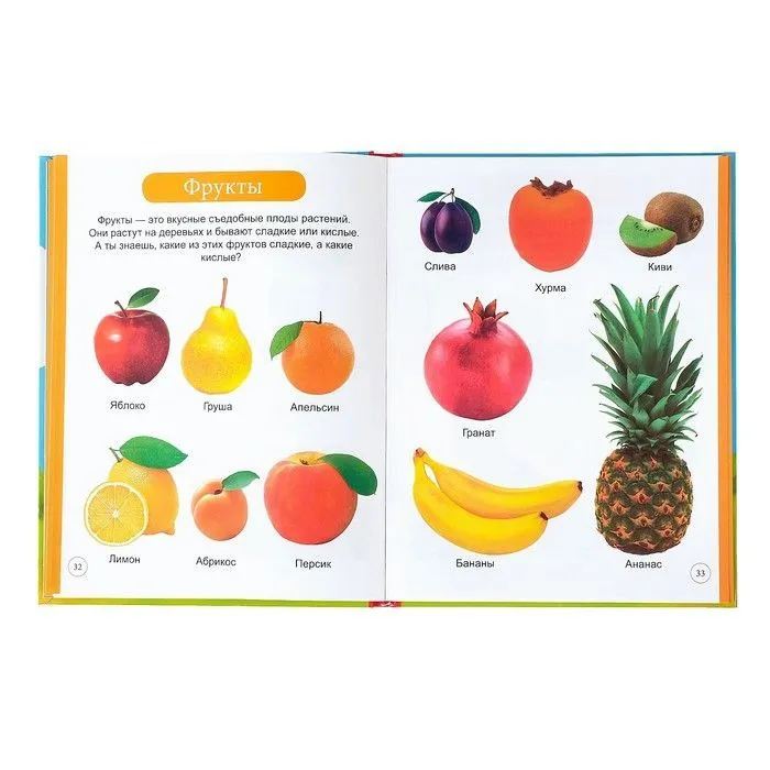 Книга познакомит с названиями любимых игрушек и одежды, животных и растений, овощей и фруктов. Малыш научится верно определять цвета и формы, ориентироваться во временах года, обучится счёту и буквам, узнает, какие бывают профессии.