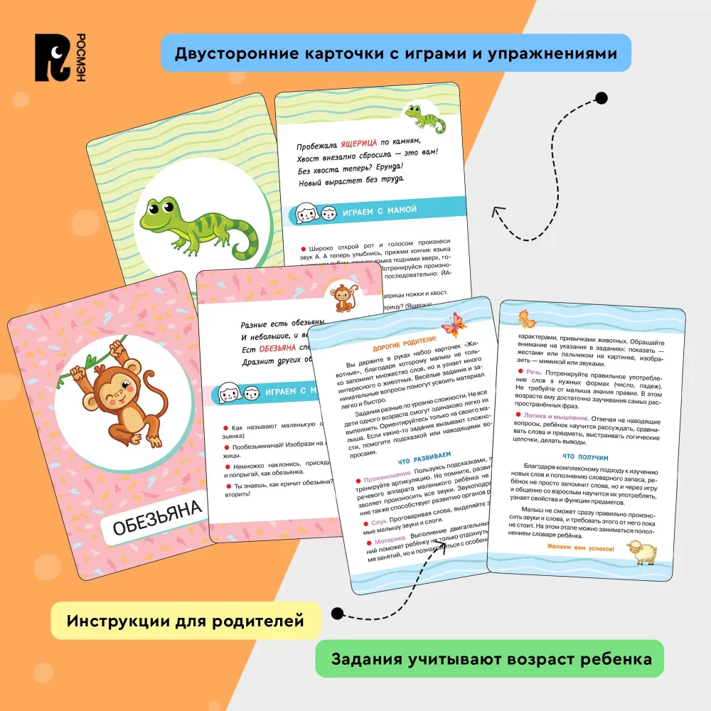 Карточки содержат упражнения разного уровня сложности. С набором можно заниматься неоднократно, помогая малышу развить слух и произношение.