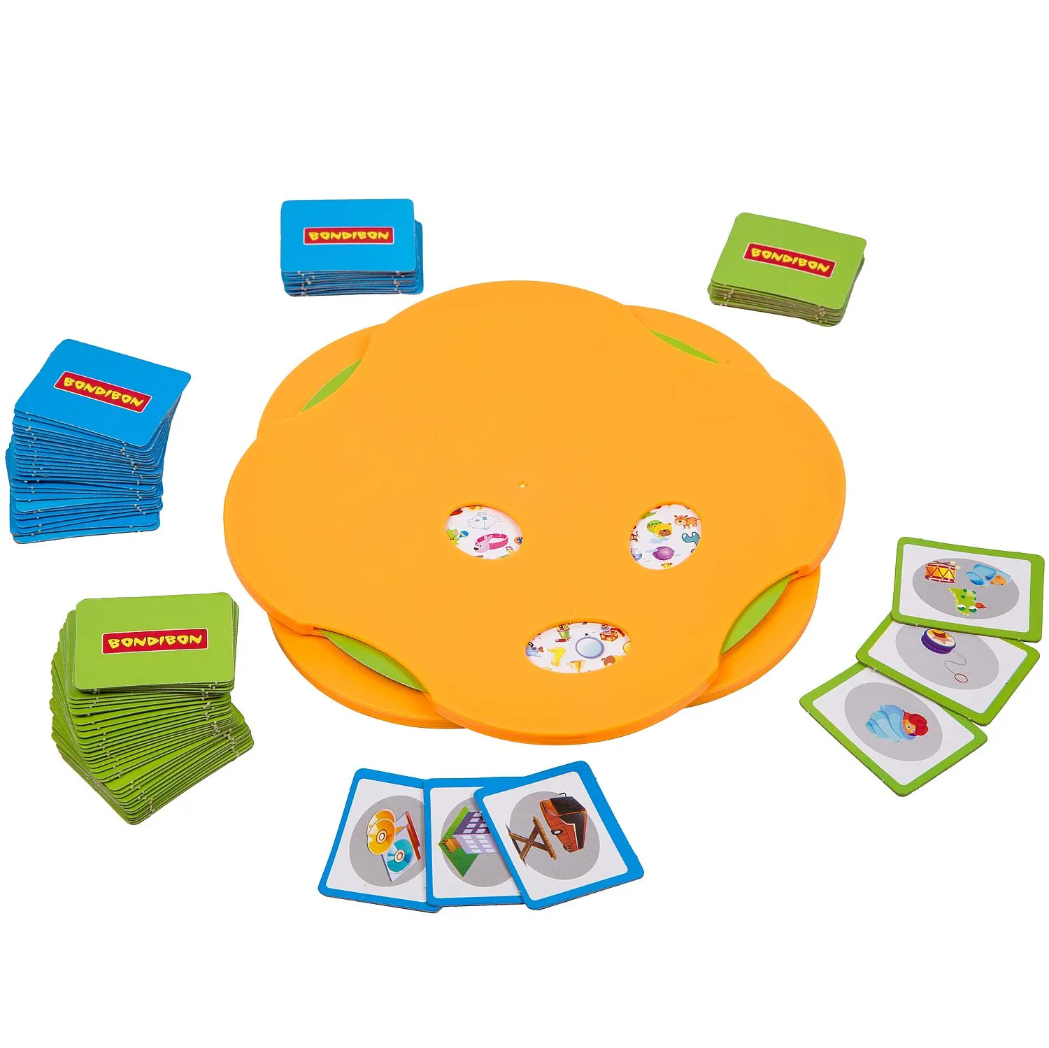 В комплекте – 40 карточек, 2 игровых поля, 16 разноцветных фишек, звонок.