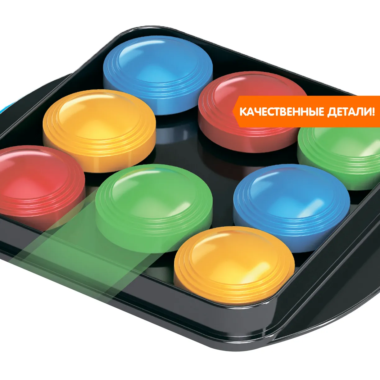 Положите игровое поле перед каждым игроком. Вытащите из колоды карту, на которой изображена определенная цветовая комбинация. Как можно быстрее повторите расположение цветов, перемещая разноцветные шайбы на своем поле. Кто первым выполнил, нажимает звонок. Если задание выполнено правильно, игрок оставляет карточку-задание себе. В случае если задание выполнено неверно, карточка-задание кладется обратно в середину колоды.