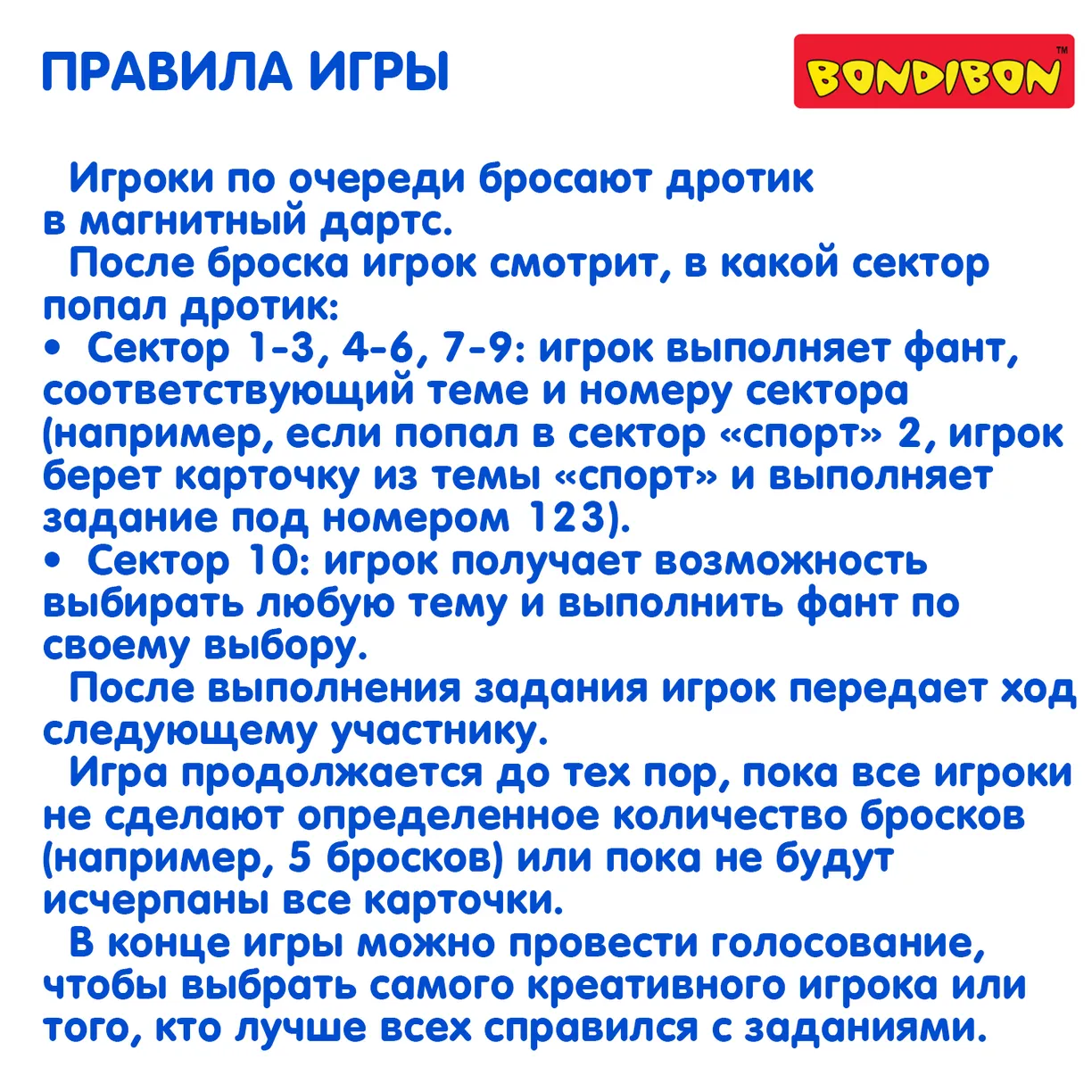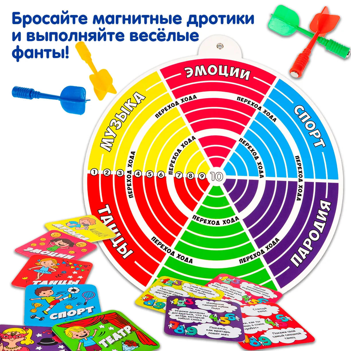 Игроки по очереди бросают безопасные магнитные дротики и выполняют задания, выпавшие на секторах мишени. Каждое попадание — это не просто меткий бросок, а новая задача для игрока! Задания очень разнообразны: от забавных танцев и звуков до спортивных упражнений. Игра развивает воображение, актерские навыки! Побеждает не самый меткий, а самый веселый и активный участник.